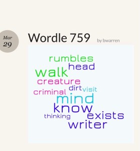 The writer spent enough time thinking of a particular creature who exists on paper. She had spent hours on visits, interviewing, trying to know and understand the felonious prisoner’s versions of their crimes. She wondered if the rumbles in her head were a walk too far into the dark dirt of the criminal mind. She was a writer, but had to distance herself from the characters she inscribed.