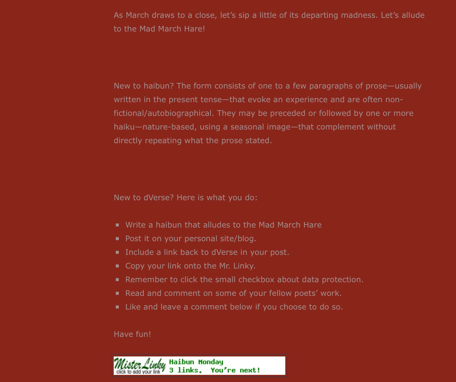 Haibun Monday 3-30-26: Mad March Hare