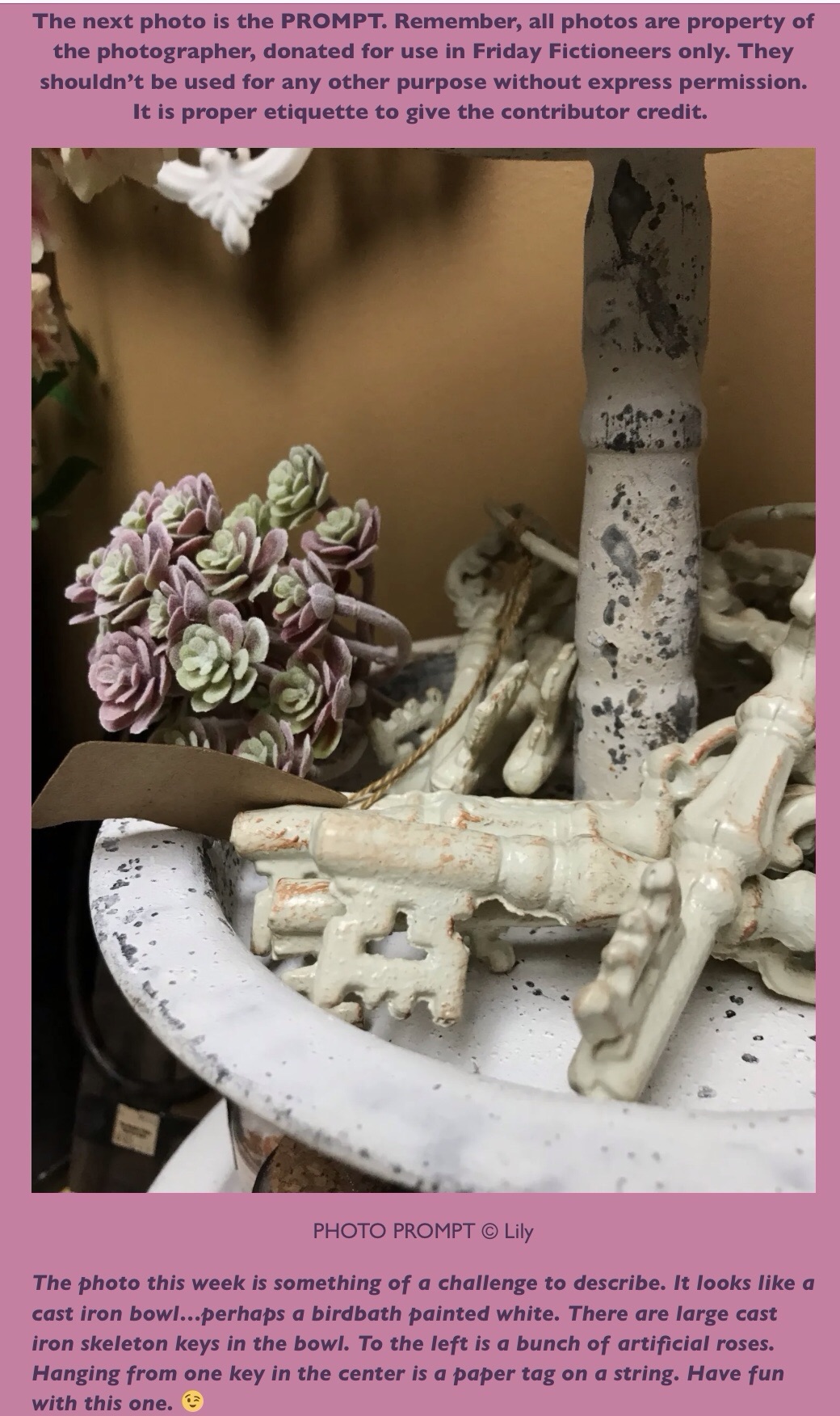 Painted iron based keys, a mystery to the small hands fiddling with great grandma’s belongings. Hands tiny, but minds heavy with curiosity. What would these keys open – a small box of secret treasures? Carol stifled a giggle as she looked at her sister, two years older. Maybe she knew, but then Mary shook her head nervously and hoped they’d get back to the tea garden soon. Mary was not the adventurous type and certainly never wanted to disappoint mother. Carol thought they were just sitting there in the bowl, and quickly snatched one for her apron pocket.